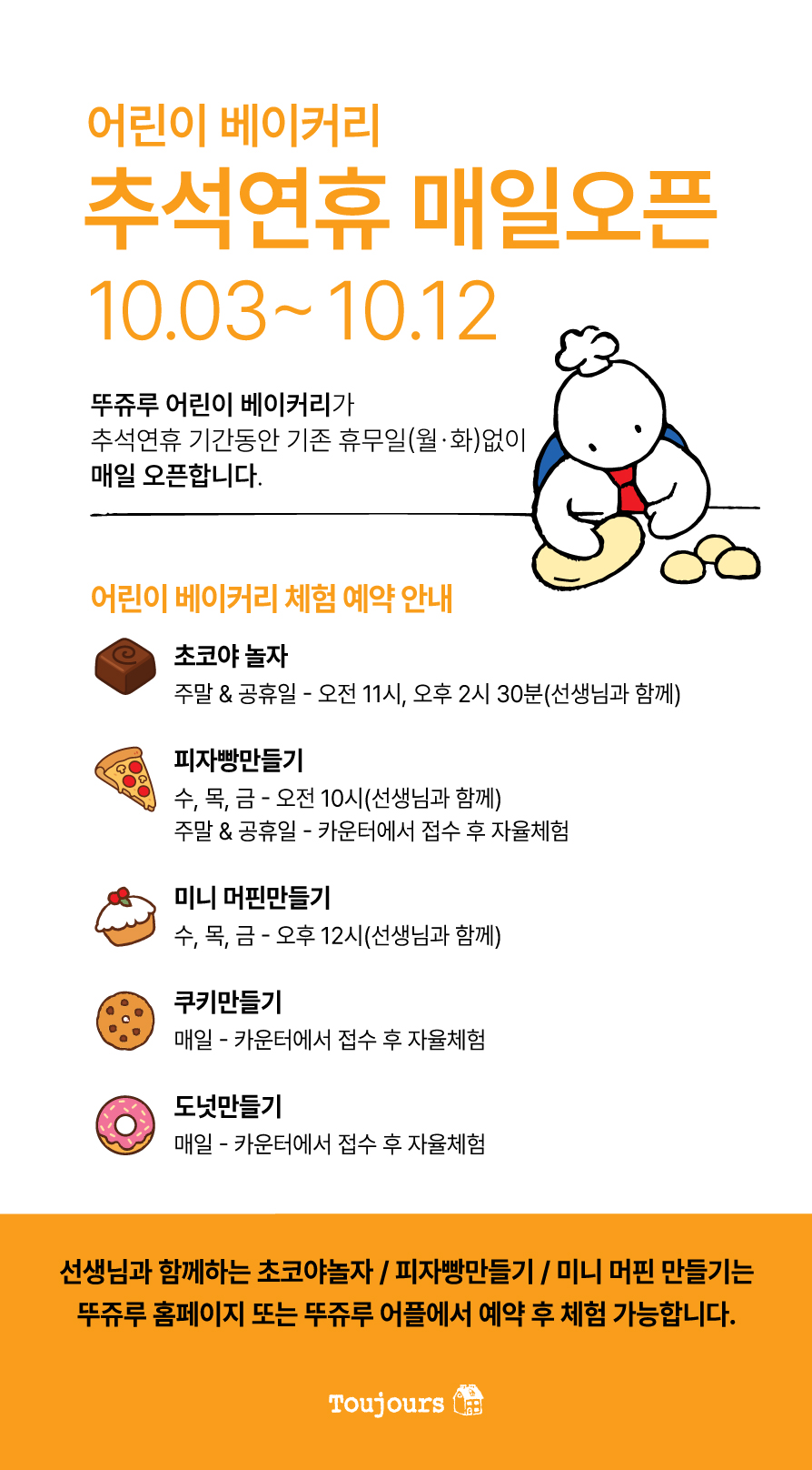 뚜쥬루 어린이 베이커리 추석연휴 체험안내