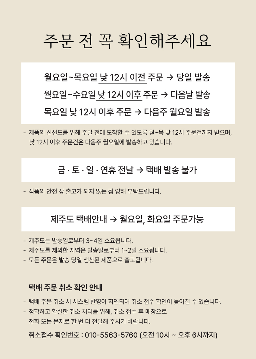 2. 배송시 부재중 또는 주소나 연락처가 불분명등으로 인한 배송지연으로 제품이 변질되는 경우 반품 및 환불이 불가 합니다.